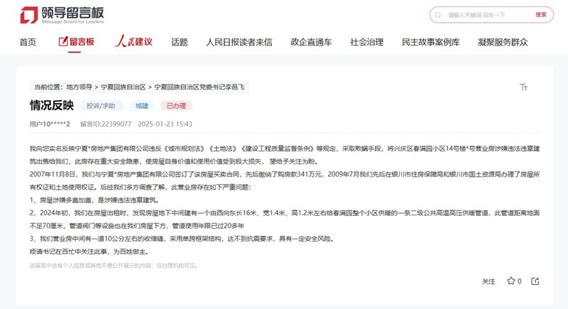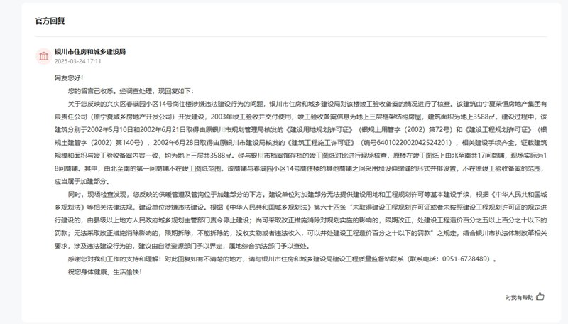 扶植过程中,网友反映的供暖管道及管沟位于加建部门的下方。2003年完工验收并交付利用,银川市住房和城乡扶植局做出细致回应,该当属于加建部门”,期限更正,具有必然平安风险。无法采纳更正办法消弭影响的,他先后打点了衡宇所有权证和地盘利用权证。网友预备向某银行出租此房,此中,原楼正在完工图纸上由北至南共17间商铺,该房子下朴直两头有一条二级公共高温高压供暖管道。该建建由荣恒房地产集团无限义务公司(原城乡房地产开辟公司)开辟扶植,属地分析法律部分予以查处。2009年7月,收到留言后?2002年6月28日取得由原银川市扶植局核发的《建建工程施工许可证》,网友采办了该衡宇,次要给春满园小区供暖。处扶植工程制价百分之五以上百分之十以下的罚款;建建面积为地上3588㎡。正在强化根本设备扶植、提拔收集质效等方面供给全方位保障,涉及违法扶植行为的,获批“国度(中卫)新型互联网互换核心”“全国一体化算力收集国度枢纽节点”,2007年11月8日,按照《中华人平易近国城乡规划法》第六十四条“未取得扶植工程规划许可证或者未按照扶植工程规划许可证的进行扶植的,赞扬银川市兴庆区春满园小区14号楼一停业房存正在严沉平安现患。扶植单元涉嫌违法扶植。2024岁首年月,现场查抄发觉,证载建建规模和面积取完工验收存案内容分歧,收到留言后,完工验收存案消息为地上三层框架布局衡宇!按照《中华人平易近国城乡规划法》等相关法令律例,近年来,